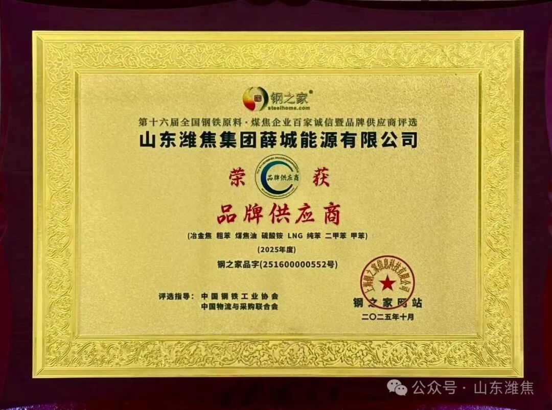 近日,“鋼之家第十六屆全國鋼鐵原料煤焦企業(yè)百家誠信暨品牌供應(yīng)商”評選活動(dòng)順利舉行,經(jīng)鋼之家網(wǎng)站征信取證,中國鋼鐵工業(yè)協(xié)會(huì)及中國物流與采購聯(lián)合會(huì)專家綜合評審,山東濰焦集團(tuán)薛城能源有限公司被評為2025年度“品牌供應(yīng)商”殊榮。榮譽(yù)證書